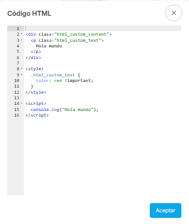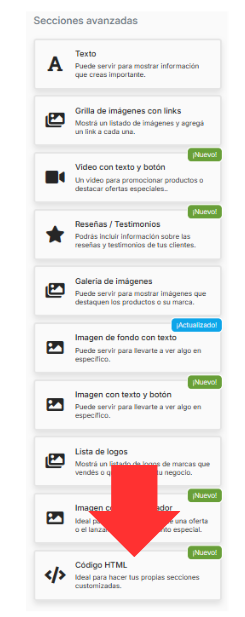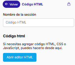 La sección Código HTML te permite insertar fragmentos de código personalizado dentro de tu tienda.