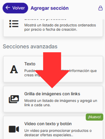 - Buscá y seleccioná “Grilla de imágenes con links” (en Secciones Avanzadas).