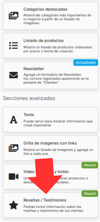- Buscá y seleccioná “Reseñas / Testimonios”.