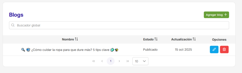 Cuando entres a la sección Blogs desde el panel de administración de Tienda Negocio, vas a ver una lista con todos tus artículos creados.