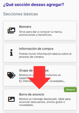 - Elegí la opción “Barra de anuncio” 📢.