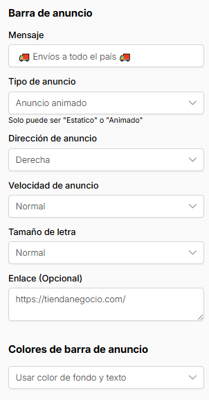 Una vez que elegís la sección, vas a poder configurar todo para que se vea exactamente como querés: podés ajustar la velocidad con la que se mueve el texto, el tamaño de la letra, el color de fondo y del texto, e incluso agregar un enlace para llevar al usuario a una página específica. 🔗