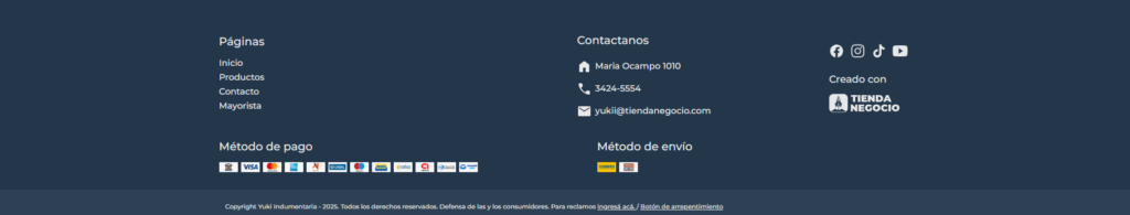 El pie de página es esa parte que aparece al final de tu tienda y que muchas veces pasa desapercibida… ¡pero es súper importante! 💼 Ahí podés poner información útil como datos de contacto, links, redes sociales o hasta un aviso legal.