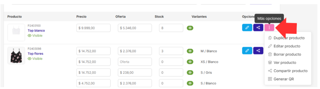 3️⃣ Dentro del producto, presioná “Más opciones” ⚙️